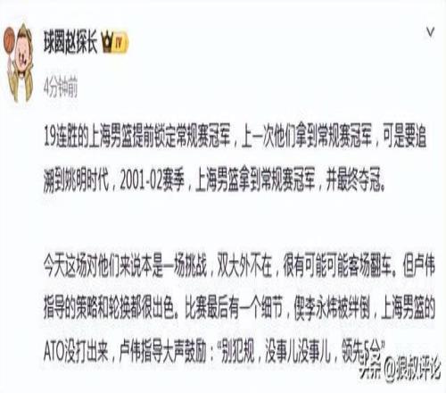 19連勝的上海男籃提前鎖定常規賽冠軍,上一次他們拿到常規賽冠軍,可是要追溯到姚明時代,2001-02賽季,上海男籃拿到常規賽冠軍,并最終奪冠。