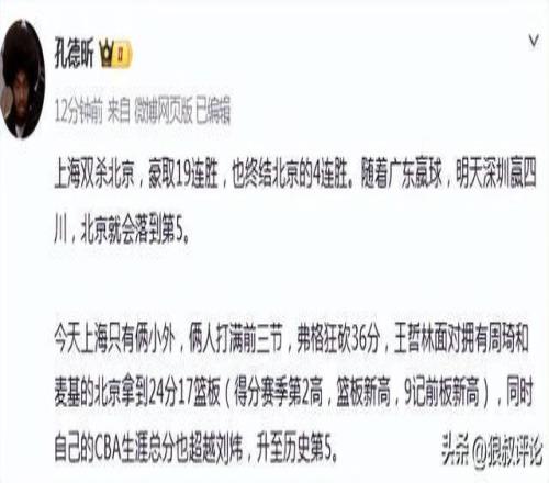 上海雙殺北京,豪取19連勝,也終結北京的4連勝。隨著廣東贏球,明天深圳贏四川,北京就會落到第5。