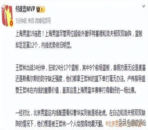 一經對比,北京男籃這內線配置看似奢華實則就是紙老虎。在白邊和洛夫頓雙雙缺陣的情況下,他們愣是被王哲林一個人給攪得地覆天翻。