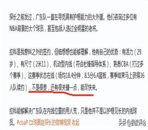 媒體人趙探長發文點評說道:廣東隊一直在尋覓具有護框能力的大外援。他們咨詢過多位有NBA背景的大個球員,甚至包括入選過全明星的老將。