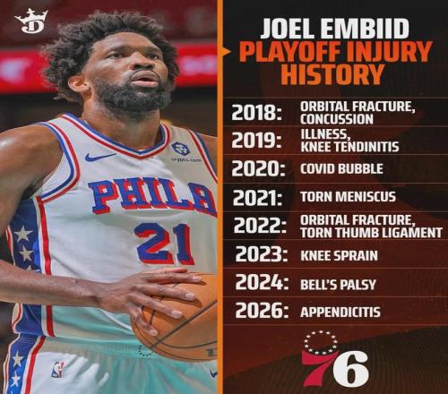 過去幾年,恩比德先后經(jīng)歷過:眼眶骨折+腦震蕩、膝蓋肌腱炎、半月板撕裂、拇指韌帶撕裂、膝蓋外側(cè)副韌帶扭傷、面癱、闌尾炎……最近三個賽季,恩比德分別出戰(zhàn)39場、19場和38場常規(guī)賽,三年加起來不夠100場,真的扎心了!