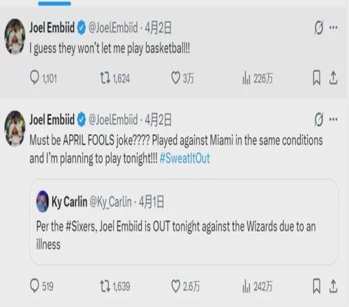 恩比德現(xiàn)在跟76人管理層矛盾重重,上賽季他想離隊治療膝傷,但球隊不允許,恩比德直接找76人老板告狀。今年4月2日,76人對陣奇才,賽前76人宣布恩比德因病缺陣。恩比德炮轟球隊:“他們就是不想讓我打球!我今晚要上場!”