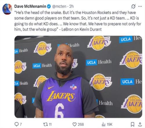 勒布朗還盛贊了37歲的杜蘭特,他表示:KD是火箭的核心,但火箭隊還有很多出色的球員,所以現在的火箭不是杜蘭特去領導,KD會按照他一貫的方式去打球,我們都很清楚這一點,我們必須為這場比賽做好周詳的準備。