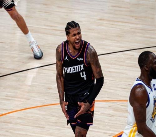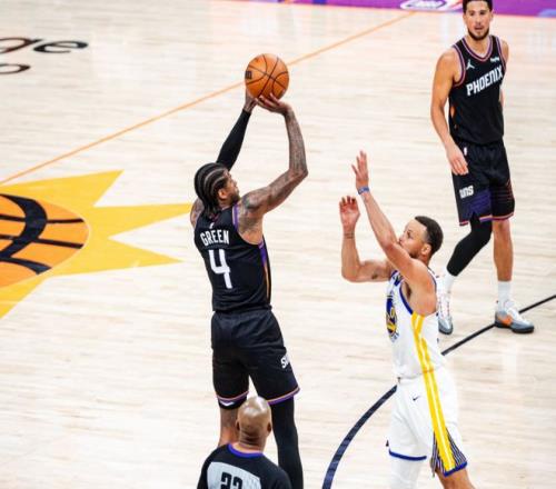 進入下半場,伊戈達羅和古德溫連續籃下得分,風雪哥軍訓波神,波神內突外投追到只差4分,布魯克斯連拿5分回應,杰倫格林續上三分球再度拉開分差。后半段杰倫格林迎著桑托斯再中三分,勇士終于依靠霍福德單打和梅爾頓的三分球上分,庫里面對夾擊,顯得有些無可奈何。杰倫格林拆炸彈再中三分,聯合布克單打守住領先優勢,三節打完,太陽78-69領先勇士。決戰第四節,又是風雪哥堅決跳投,庫里和古德溫對轟三分,此后梅爾頓和庫里下起三分雨,正要起勢時,風雪哥又來!
