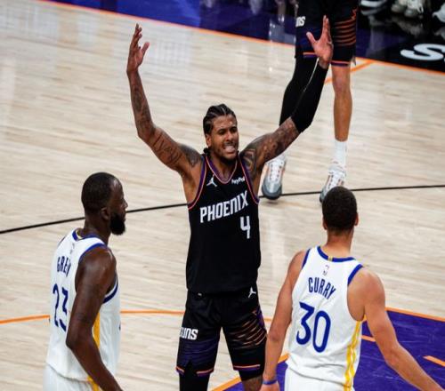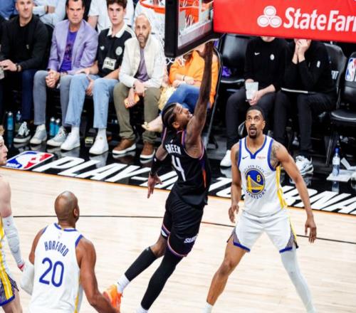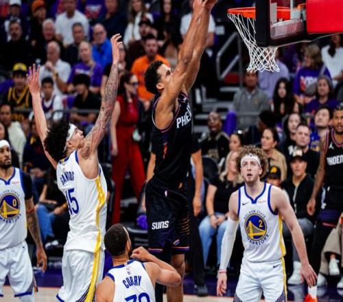 但太陽手感確實好,布魯克斯和格林下三分雨,分差一度到14分!節末太陽繼續發力,布克接球上籃打3分,奧尼爾空位三分球命中,勇士又連續失誤,布克撤步跳投命中,第一節太陽33-15領先勇士。進入第二節,波杰姆斯基聯合佩頓追分,很快就打停太陽。暫停回來太陽開始點名庫里這一點,梅爾頓和霍福德追到個位數分差,危急時刻,杰倫格林三分止血!后半段波杰姆斯基定點三分+庫里撤步三分,隨后庫里喂餅桑托斯,追夢助攻波杰姆斯基,節末杰倫格林高難度漂移三分,半場結束時,勇士追到45-50!