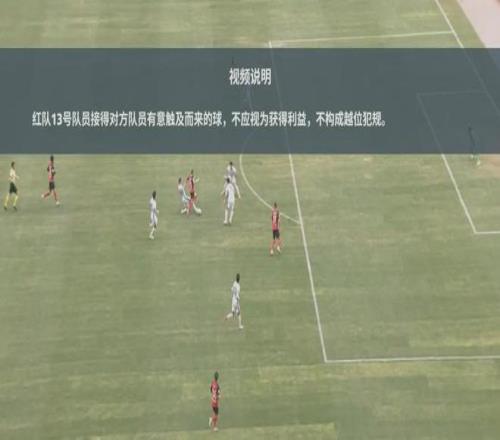 在陜西聯合與南通支云的比賽中,足協判罰標準認定:紅隊13號球員接得對方球員有意觸及而來的球,不應視為獲利得益,不構成越位犯規。判罰決定為不犯規。
